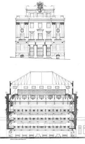 En el proyecto de Luque se pueden encontrar elementos característicos de estos edificios, como son las cúpulas amansardadas de las esquinas (que no se llegaron a construir) o las cristaleras artísticas de los accesos a la planta primera, de los ventanales del pasillo y del propio edificio del Museo. El espacio del Museo es una nave diáfana, de 19 metros de altura y planta rectangular, que ocupa 713 metros cuadrados de superficie. La cubierta es de estructura metálica y policarbonato, que fue reemplazada durante las últimas obras acometidas a finales de los 80 por la original de vidrio armado con juntas de plomo. En altura se disponen tres corredores perimetrales volados al espacio central, a los que se accede mediante tres escaleras de caracol y un ascensor, situados en los cuatro vértices de la planta. Los pisos son de parquet-tarima, las barandillas de las balconadas de hierro forjado, y las paredes, enlucidas con yeso y decoradas con escayolas (destacando las conchas y escudos de los vértices superiores). El falso techo de la sala constituye una vidriera policroma horizontal y otras perimetrales en semibóvedas. Los motivos decorativos principales son un gran escudo real en el centro y cuatro escudos alegóricos del Cuerpo de Minas que ocupan la parte central de cada uno de los lados.