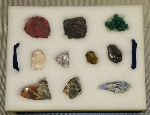 Se trata de un taller en el que se parte de un conjunto de diez minerales, nueve de ellos metálicos (distena, cinabrio, esfalerita, fluorita, galena, lepidolita, magnetita, malaquita y wolframita) y uno no metálico (ortosa).