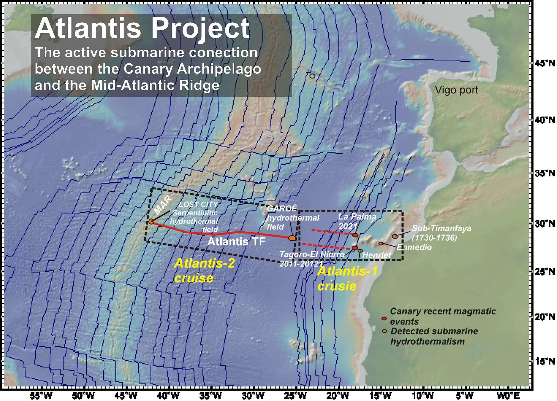 Área de estudio del proyecto ATLANTIS y campañas oceanográficas previstas para la exploración y adquisición de datos de los sistemas hidrotermales