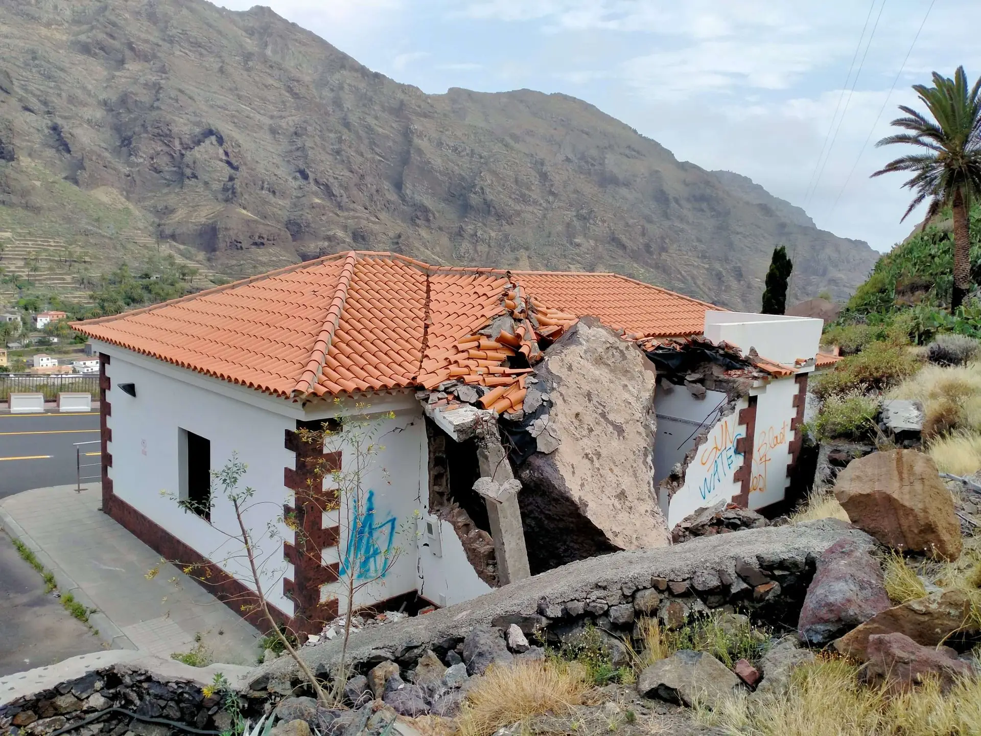 Desprendimiento rocoso cuyos bloque impactaron contra el tanatorio de Valle de Gran Rey (La Gomera)