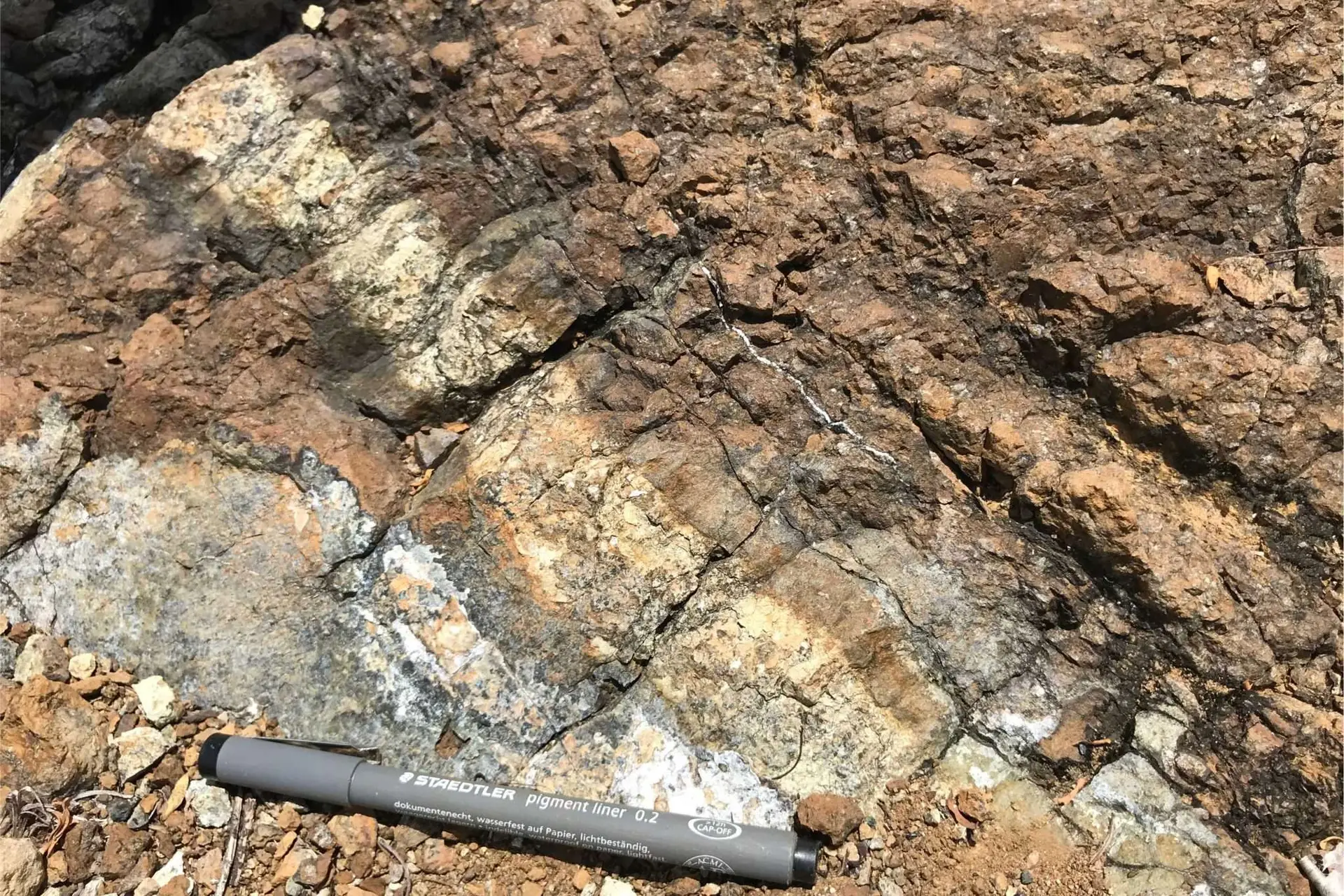 Dique de ortopiroxenita intrusivo en harzburgita.