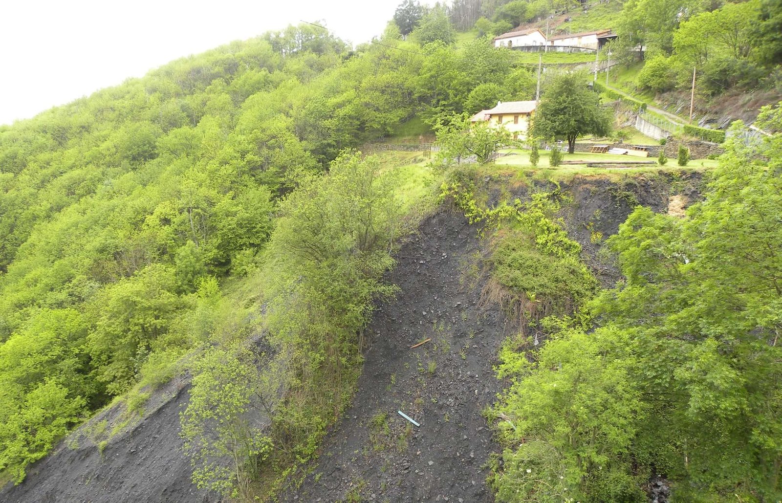 Escombrera abandonada con antropización en la zona de Mieres (Asturias), que puede provocar problemas de estabilidad de taludes o riesgo de colapso de las edificaciones.