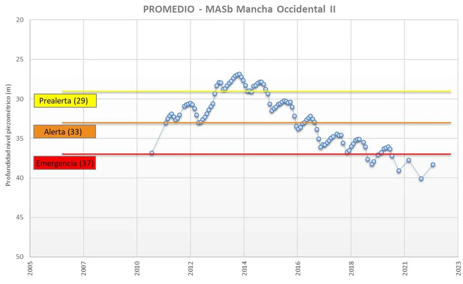 La medidas del nivel piezométrico tomadas en campo a lo largo de un largo periodo de tiempo conlleva a gráficos de Evolución Piezométrica en la MASb Mancha Occidental II.