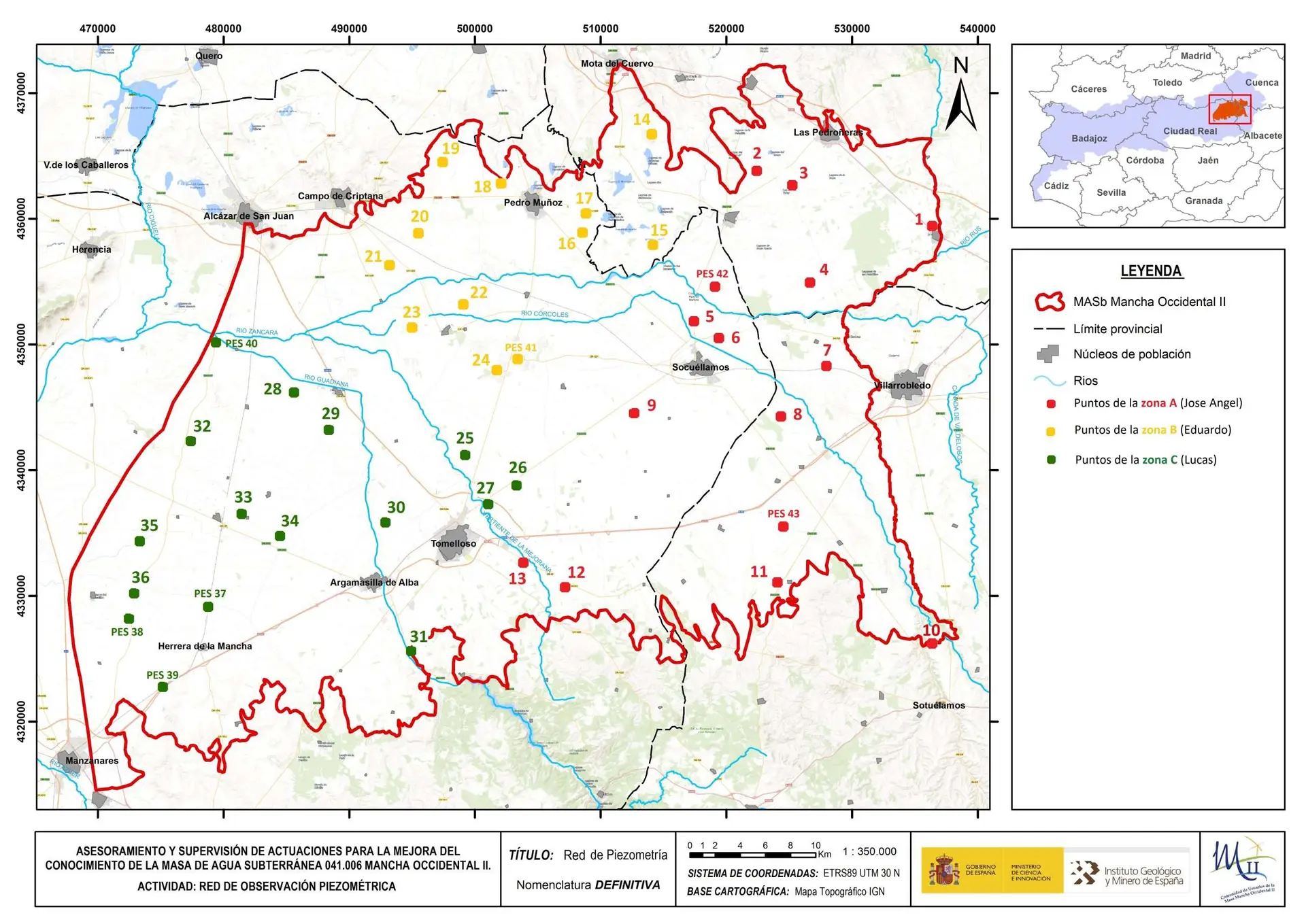Mapa de la red de Observación piezométrica configurada por el CN IGME-CSIC y gestionada por la CUAS MOII.