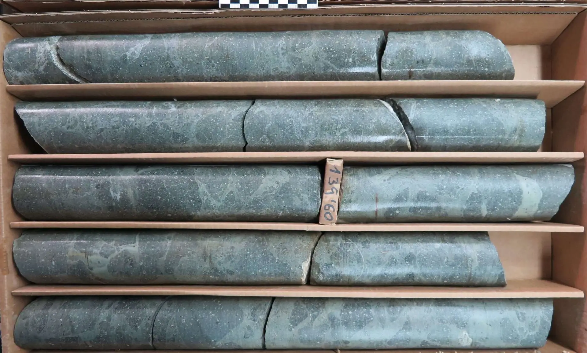 Testigo del sondeo Bramadero-1 realizado durante la campaña de exploración minera en la Faja Pirítica Ibérica. La roca es una brecha hialoclástica andesítica.